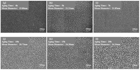 Figure 3 and Figure 4 show the morphology of the phase in the solution-treated alloy after aging at 850 °C and 800 °C over time, respectively, and the average diameter of the phase is given in Figure 5a. The results indicate that, after aging for the same duration, the particle diameters at 850 °C were larger than those at 800 °C. During aging from 1 h to 20 h at 850 °C, the average particle radius of the phase increased from 23.17 nm to 51.40 nm. At 800 °C, the aging process from 0.5 h to 20 h saw the average particle radius of the phase grow from 14.77 nm to 34.34 nm. The phase maintained a spherical morphology throughout the aging process at both 850 °C and 800 °C.