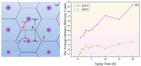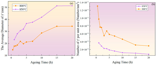 As shown in Figure 5b, the number of phases per unit area showed an overall decreasing trend. At the same aging duration, the number of phases per unit area at 800 °C was significantly higher than at 850 °C. This is because at higher temperatures, the diffusion rates of solute atoms and vacancies are greater, resulting in a faster dissolution rate of smaller-sized phases. Therefore, the higher the temperature, the lower the particle density at the same aging time.