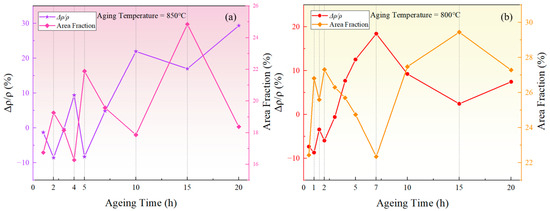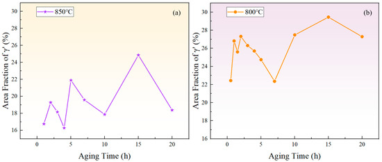 In summary, during aging for 1–2 h, 4–5 h, and 10–15 h at 850 °C, and during aging for 0.5–1 h, 1.5–2 h, and 7–15 h at 800 °C, the area fraction showed an upward trend, indicating that the growth of the larger-sized phase dominated in these periods, and the solute concentration in the matrix decreased. In contrast, during aging for 2–4 h, 5–10 h, and 15–20 h at 850 °C, and during aging for 1–1.5 h, 2–7 h, and 15–20 h at 800 °C, the area fraction exhibited a downward trend, suggesting that the redissolution of the smaller-sized phase was the predominant process, and the solute concentration in the matrix increased.