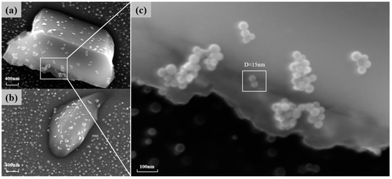 (a,b) The particles around the carbide when carbide decomposition occurs at 850° C for 10 h of aging; (c) a magnified image of finer particles.