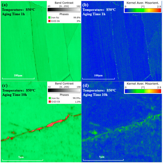 where represents the Burgers vector. is the scanning step size. is the KAM angle. As shown in Figure 10a,b, after being aged at 850 °C for 1 h, no phase was observed in the phase map, and the KAM value near the grain boundaries distributed uniformly. However, as shown in Figure 10c,d, after 10 h of aging, carbides precipitated at grain boundaries. Higher KAM values could be observed near the carbides, indicating a greater dislocation density and higher degree of lattice distortion around the carbides, compared to other regions.