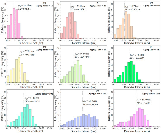where, denotes the mean of the sample, represents the median of the sample, and signifies standard deviation of the sample. When SK = 0, the particle diameter follows a normal distribution; SK > 0 indicates a higher proportion of larger-sized phases, and vice versa. With the aging time prolongation, SK changed from positive to negative, indicating that small size particles gradually dissolved, and the proportion of larger-sized particles increased. This indicates that ripening occurs during short-term aging.