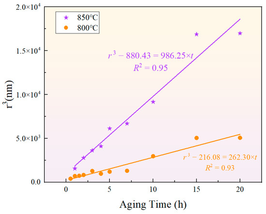 The classical formula for particle size evolution based on the LSW theory is given by , where represents the average radius of the phase, is the critical nucleus radius, and is the coarsening rate constant. Although the classical LSW theory assumes that the precipitated phase is in equilibrium [52,53,54,55], the results indicate that the cube of the phase radius presents a relatively high fitting goodness, as shown in Figure 12. This suggests that the particle size of the phase during short-term aging can be predicted by the LSW theory. Meanwhile, the growth rates of the phase during short-term aging at 850 °C and 800 °C were and , respectively, showing that a higher temperature results in a greater growth rate.
