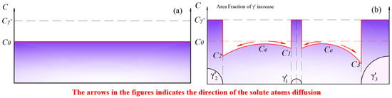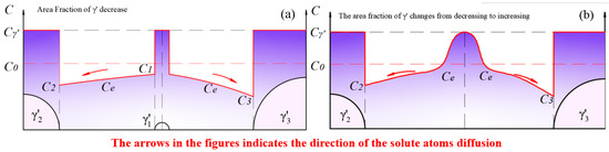 Solute concentration distribution at (a) the stage when the redissolution process of smaller-sized particles was dominant; (b) the moment when the smaller-sized phase disappeared.