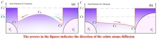 The diffusion coefficient, , of solute atoms in the matrix is concentration-dependent. Within the temperature range of 800 °C to 900 °C, when the Al content in the Fe-based matrix was less than 20%, the interdiffusion coefficient increased with the concentration of Al solute atoms [63]. Similarly, the diffusion coefficient of Al in Ni-based matrices also increased with the concentration of Al [64]. This implies that and . That is, for two adjacent particles of different sizes, when competitive growth occurs, it can be found from Equation (11) that , meaning that when competitive growth occurs, the dissolution rate of the smaller-sized exceeds the growth rate of the larger-sized under the same chemical driving force. As a result, the dissolution of the smaller-sized dominated at this stage, leading to a decrease in the area fraction. Such a process maintained until the moment when the smaller-sized phase disappeared, as shown in Figure 14b. The dissolution rate fell to 0, while residual solute atoms kept contributing to the growth of the adjacent phase. In other words, Figure 14b represents the inflection point where the area fraction changed from decreasing to increasing.