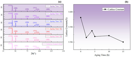 (a) XRD diffraction patterns corresponding to different aging times at 850 °C; (b) changes in the average lattice constant calculated from 2θ.