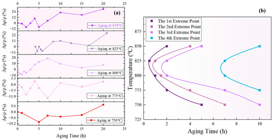 According to the prior analysis, an increase in indicates that the redissolution of small-sized particles was the dominant process, leading to a decrease in the total amount of the phase. Conversely, a decrease in suggests that the growth of the phase is the dominant process, resulting in an increase in the total amount of the phase. Therefore, the inflection points in the curve can be regarded as the transition points between alternate dominance of the redissolution and growth processes. Figure 17a displays the curves of the novel nickel–iron-based alloy aged at 750 °C, 775 °C, 800 °C, 825 °C, and 850 °C for various durations, which all exhibited fluctuation. Four curves can be obtained by connecting the 1st, 2nd, 3rd, and 4th extreme values in order of temperature, as shown in Figure 17b.