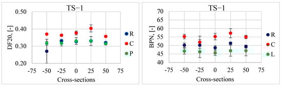 Figure 9 shows the results of the DFT20 and BPN friction coefficients in the left (L), and right (R) track and between the wheel tracks (C) on individual test sections. Table 1 summarizes their descriptive statistics, i.e., average values. STD represents standard deviations, and V represents coefficients of variation.