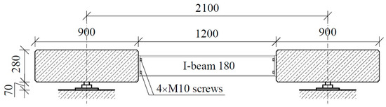 For this study, we designed a platform with dimensions of 18.0 × 3.0 m and constructed a platform composed of three simply supported spans, each with a span of 6.0 m. Another objective was to reduce the total weight of the platform to 24 tons based on the maximum load capacity of a standard 20 ft container. This value is optimal from the perspective of transportation economics. Therefore, we decided to design the platform using two parallel concrete tracks for the wheels with a cross-section of 0.9 × 0.28 m, connected with steel I-beams. The plan for the platform is presented in Figure 1, while the cross-section is given in Figure 2.