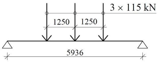 Figure 8 shows the scheme of the test stand along with the location of the measuring gauges. Figure 9 shows a view of the stand. The frontal angle bracket support was rotated by 180° relative to the designed slabs. The bracket’s geometry and affixing scheme were, however, preserved. In addition, a two-point load was used for the slab. We selected 0.85 m spacing for the loading rails to achieve the same bending moment as that of the three-point load caused by three axles (2 × 90 kN instead of 3 × 60 kN) under a two-point load.
