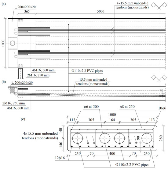 Originally, we assumed dimensions of 0.9 × 0.28 mm for the full cross-section of the slab. A preliminary analysis of the calculations showed that designing a slab capable of working in a non-cracked state would be extremely difficult due to the small share of the slab’s own weight in the total load. Implementing crack resistance required the use of 16 15.5 mm strands in each slab. Therefore, we chose to design partially prestressed elements containing 4 unbonded tendons (Figure 5) in each slab with an overhang of 50 mm and a characteristic strength of 1860 MPa. The initial force in each tendon was set to 200 kN. The slab was reinforced near the bottom surface with 12 ribbed bars of 16 mm in diameter. Transverse reinforcement used 6 mm diameter doubled strips with spacing every 250 mm. In addition, 6 longitudinal bars with diameters of 8 mm were used near the top surface. The slabs were made of class C40/50 concrete (according to EC2) based on basalt aggregate and Portland cement. The slabs were prestressed no earlier than 14 days after concreting.