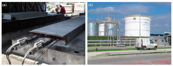 The European market offers a wide range of truck scales, usually with a nominal load capacity of 6 to 90 tons [1,2]. The basic requirements for truck scale platforms include high durability, stiffness, and light weight. Scales with a working range up to 20 tons are used most frequently as portable steel platforms. Scales with larger nominal capacities are produced as recessed or overground structures, usually made from steel, reinforced and prestressed concrete, or steel–concrete (steel bearing beams with a filling RC panel). Unfortunately, these three requirements are mutually exclusive in any constructional solution. Truck scales with steel platforms are lighter but remain prone to corrosion and require additional resources to maintain their condition during their lifetime. Reinforced concrete and steel–concrete slabs are cheaper to maintain and have higher durability than steel platforms. The main disadvantage of RC slabs is their high weight, which increases the costs for transporting such slabs. For example, the weight of a single module of a reinforced concrete platform with a capacity of 60 tons and a length of 6.0 m can be over 10 tons, while the weight of a whole platform with a length of 18.0 m can be 32 tons. The solution that best fulfills all requirements is post-tensioned concrete. This technology allows the construction of slender panels (light in weight) with high stiffness and good durability.