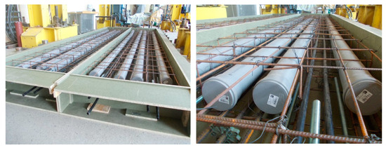 After producing a few platforms, a width of 0.9 m proved to be too narrow for practical application of the scales and was, therefore, increased to 1.0 m. Further platforms were constructed using panels with cross-sections of 1.0 × 0.28 m. These panels were also too heavy. The weight of the slab significantly exceeded 4 tons, while the weight of the whole platform exceeded a value of 24 tons. Consequently, the platform exceeded the load of standard trucks and could not be transported as a whole, which significantly increased the cost of transport. We then found an easy and low-cost solution, which involved reducing the weight of the slabs. Since weakening a cross-section at the edges strongly reduces the moment of inertia, which is very important in a prestressed cross-section, the introduction of empty spaces at the bottom edge of the slab was undesirable. Consequently, we decided to use empty cores inside the section of the slab (Figure 5). For this purpose, standard PVC pipes ø110 × 2.2 mm were used. Four cores with a length of 5.0 m were introduced, with the corresponding locations shown in Figure 5. Each of the cores decreased the weight of the slab by approximately 240 kg. Thus, the whole slab became 960 kg lighter, while the platform became 5760 kg lighter.