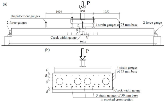 The scheme of the test stand with the locations of the measuring gauges: side view (a) and slab cross-section (b).