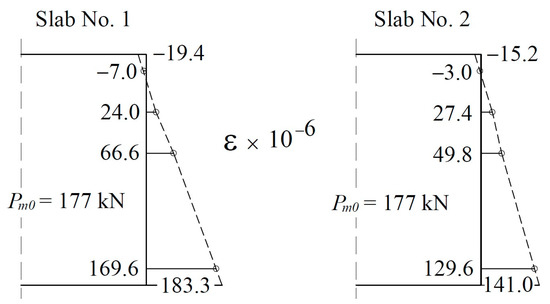 Slabs No. 1 and No. 2 were prestressed 89 and 112 days after concreting. The cables were tensioned under a force of 200 kN with the same equipment and technology used to prestress mass-produced slabs. Figure 10 shows the strain distribution at the cross-section of the center as a result of post-tensioning based on the strain values measured by the strain gauges on the side surfaces. The strain values at the edges of the cross-section were estimated by extending the strain curves. The same figure shows the average values of forces in the tendons after anchoring (177 kN). The values in the two slabs are similar (equal to 6 mm) and differ slightly from the design value (4.4%) calculated for slippage of the wedges in real-life anchorages (169.6 kN). Direct conversion of the strain into stress is always burdened by errors due to differences in the modulus of elasticity for small samples of concrete compared to that for full-scale structures. For this reason, stresses determined using strains should be regarded as only a rough estimation. For slab No. 1, the stresses were calculated as −0.81 MPa for the upper edge and 8.3 MPa for the lower edge. The same values for slab No. 2 were calculated as −0.64 MPa and 5.9 MPa, respectively. Meanwhile, the predicted values were −2.6 and 8.0 MPa (Table 1). Notably, slab No. 2 presented significantly smaller strain values, despite a similar prestressing force. This result was confirmed by camber to be 1.98 mm for slab No. 1 and 1.8 mm for slab No. 2. This result could be due to differences in the modulus of elasticity or prestressing geometry.