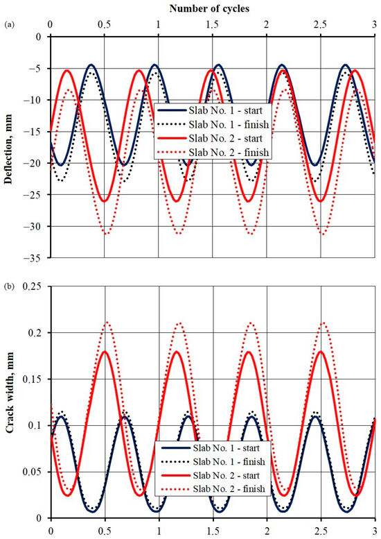 Figure 11 illustrates the deflection and crack width development at the beginning (after 1000 cycles) and end (after a million cycles for slab No. 1 and 888,000 cycles for slab No. 2) of the repetitive load test. For slab No. 1, when the load changed from 20 to 150 kN, deflection initially changed from 4.4 to 20.4 mm (continuous dark blue line) and from 5.7 to 22.9 mm at the end (dotted dark blue line). The crack width changed from 0.01 to 0.11 mm at the start and from 0.01 to 0.12 mm at the end. For slab No. 2, when subjected to a load change within the limits of 40 and 180 kN, deflection oscillated between 5.3 and 26.2 mm at the start (continuous red line) and between 8.4 and 31.2 mm at the end (dotted red line). The crack width changed from 0.025 to 0.18 mm at the start and from 0.03 to 0.21 mm at the end. The results indicate that the deflection and crack width grew alongside an increase in the load cycles, especially for slab No. 2.