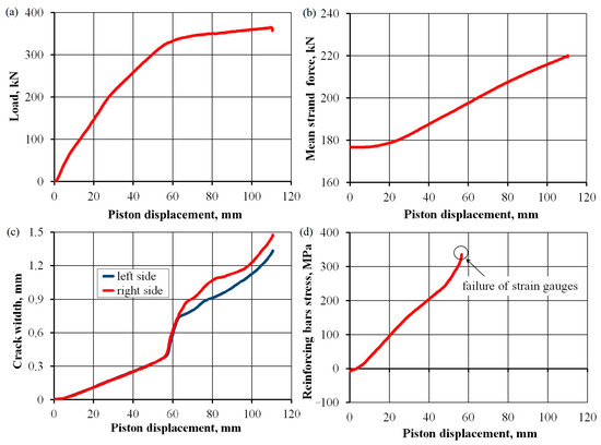 Development of selected parameters during the destruction test of slab No. 1: piston load value (a), mean strand force (b), crack width (c), and reinforcing bars stress (d).