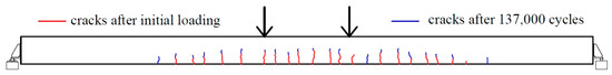 Figure 14 shows an arrangement of registered cracks on one of the side surfaces of slab No. 2. Here, the cracks formed immediately upon loading the slab with a force of 180 kN are marked in red. Blue indicates the propagation of cracks after 137,000 load cycles. Further cyclic loading revealed no coverage growth or new cracks. The average spacing of cracks in the cross-section between concentrated forces amounted to 130 mm, with widths ranging from 0.1 to 0.2 mm.