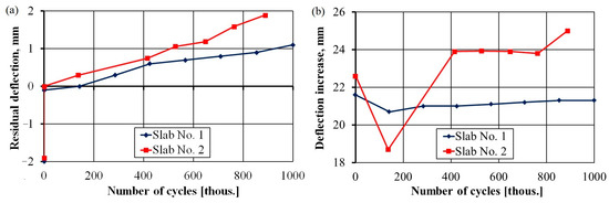 The wait time was approximately 30 min after the cyclic loadings were stopped, after which the residual deflection of the slab was registered, as shown in Figure 15a. Due to prestressing, the 2 mm camber of slab No. 1 and 1.8 mm camber of slab No. 2 were permanently eliminated during the initial loading of the slabs. Residual deflections increased with the number of load cycles. For slab No. 1 (under a cyclic load of 150 kN) and slab No. 2 (under a cyclic load of 180 kN), the residual deflection was 1.1 mm after 1 million cycles and 1.9 mm after 888 thousand cycles.