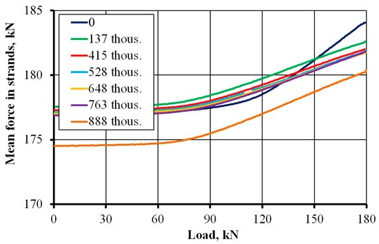 The significant increase observed in the deflection of slab No. 2, between 763 and 888 thousand cycles, was produced by a significant decrease in the force of one of the strands (Figure 16), which is discussed in the analysis of prestressing forces. Excluding this case from further analysis, the increase in deflections was 21.3 mm for slab No. 1 and 23.9 mm for slab No. 2, constituting 1/278 and 1/248 of the span, respectively. Thus, we can conclude that the limit value was almost achieved for the two slabs based on a limit value of L/250.