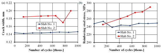 Figure 17 shows the changes in the width of cracks and stresses in reinforcing steel with an increase in the number of cycles. In both cases, an upward trend can be observed. The width of the crack remained at a safe level throughout the entire range of loading. In slab No. 1, the width fluctuated between 0.14 and 0.15 mm, while in slab No. 2, the width fluctuated between 0.18 and 0.19 mm. Notably, the width of the crack was smaller than the calculated value of 0.21 mm. The average spacing of cracks was 130 mm—more than two-times lower than the theoretical value of 310 mm. The stresses in ordinary steel oscillated around a calculated value of 245.9 MPa for slab No 1 and clearly increased with the number of cycles for slab No. 2.