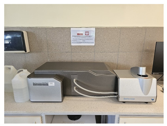 Samples for laboratory tests were prepared in accordance with the procedure described in the PN-EN 196-1 standard, in the form of bars with dimensions of 40 mm × 40 mm × 160 mm. After mixing the materials in a standard mixer, the samples were compacted in two layers in three-part molds on a shaking table with 60 blows for each layer. Nine samples were prepared for each additive and three samples for each maturation time, i.e., for 7, 28, and 56 days of maturation of the mortar samples. In the first stage of the tests, 10% of the cement content was replaced with a mineral additive, and in the second stage, 20% of the cement content was replaced with a mineral additive. In order to compare the effect of individual additives and their content, a reference mortar without mineral additives was prepared, consisting of 450 g of cement, 1350 g of standard sand, and 225 g of water. The analysis of materials began with the determination of the grain size analysis of mineral additives and cement, together with the determination of the specific surface area. The measurement of particle size and specific surface area was performed using the Bettersizer S3 Plus Laser Particle Size Analyzer from Dandong Bettersize Instruments Ltd. (Dandong, China), as shown in Figure 2. The tests were carried out using distilled water as a medium for dispersing the measuring material. Since the mass of the sample used during the measurement is only 10 mg, it was decided to perform three tests for each mineral additive.