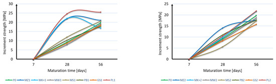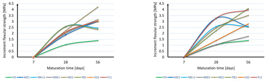 Based on the analysis of the obtained results, it can be stated that it is not possible to unequivocally determine the effect of mineral additives and their content on the flexural strength of mortar samples. In the case of strength after 7 days of maturation, all mineral additives are characterized by a strength lower by 5% to 37% than mortar samples without additives. The most favorable of all are samples with a 10% addition of both Mikrosilika (MZ1 and MK+1) and ash (PL1). In the flexural strength test after 28 days of maturation, samples with the addition of 10% and 20% Mikrosilika (MZ1, MK+1, MZ2, MK+2) and with a 10% addition of fly ash (PL1) achieved a flexural strength greater than samples without mineral additives. In the case of the flexural strength test, after 56 days of maturation, half of the samples achieved flexural strength equal to or greater than samples without additives. The lowest strength was characteristic for samples with 10% content of mineral additives in the form of limestone flour (MW1), basalt dust (PB1), and glass granulate (GS1) and with 20% content of mineral additives in the form of compacted microsilica (MZ2), limestone flour (MW2), basalt dust (PB2), and glass granulate (GS2). Analyzing the obtained results, it can be stated that the flexural strength does not depend directly on the specific surface area of the mineral additive used. Based on the flexural strength results, an analysis of the increase in flexural strength during the maturation of the samples was made for each additive, depending on its content. Figure 4 shows the results of the sample strength over time, while Figure 5 shows the strength increases over time. For each sample, the reference value was the bending strength after 7 days of curing. The strength increases were presented as the strength increase after 28 days and after 56 days relative to the strength after 7 days for each additive separately.