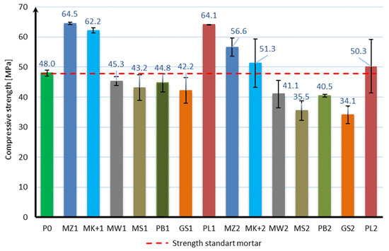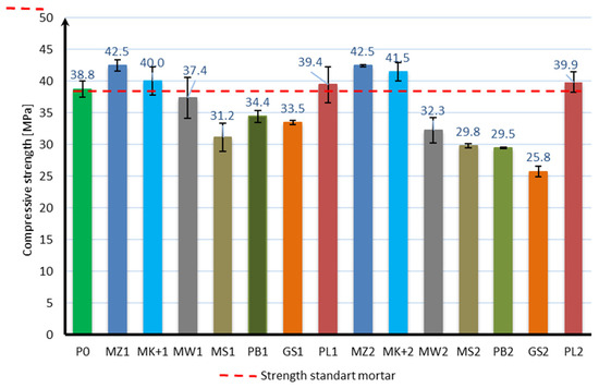 - An increase in the flexural strength of the standard mortar was obtained for the additive MIKROSILL+ microsilica; for the remaining additives, the results obtained were comparable to or lower than the reference mortar.
