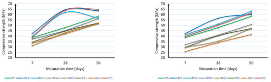 The compressive strength of the mortar samples was performed in the same way as for the bending strength test after 7, 28, and 56 days of curing. The bending strength test results are shown in Figure 6, Figure 7 and Figure 8: