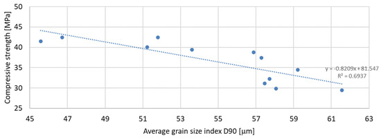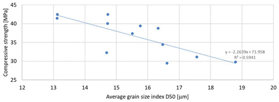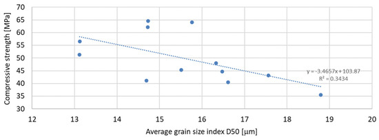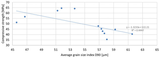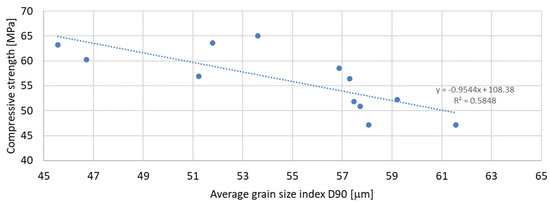 Analyzing the above results, it can be stated that the highest dependence of compressive strength on the D50 index is characteristic of samples after 7 days of conditioning, for which the R-squared index is equal to 0.5941. Next in terms of convergence are the results of samples after 56 days of curing, for which the R-squared index is equal to 0.4414, while the lowest dependence on the D50 index is characteristic of samples after 28 days of curing, for which the R-squared index is equal to 0.3434. It should therefore be stated that compressive strength does not depend directly on the value of the D50 index.
