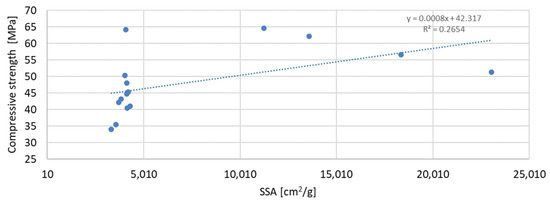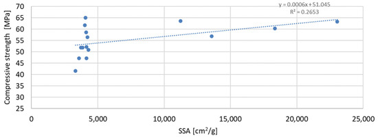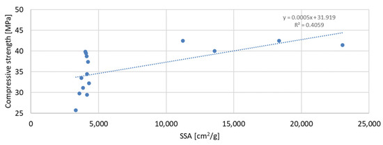 The above-presented dependencies show that the compressive strength depends much more on the D90 index than on the D50 index. For the seven-day strength, the R-squared index is the highest and equal to 0.6937; next in value is the R-squared index for the strength after 56 days of curing, equal to 0.5848; and the lowest, as in the previous case, is the strength after 28 days of curing, which is equal to 0.4447. Despite much greater dependencies, there is no significant effect of the grain size of the mineral additive on the compressive strength of the mortar samples observed in the tests. A much smaller correlation was obtained for the dependence of the compressive strength on the specific surface area of the mineral additives. In this analysis, the mineral additive in the form of glass grit was not omitted. The results of the obtained dependencies are presented in Figure 17, Figure 18 and Figure 19: