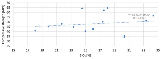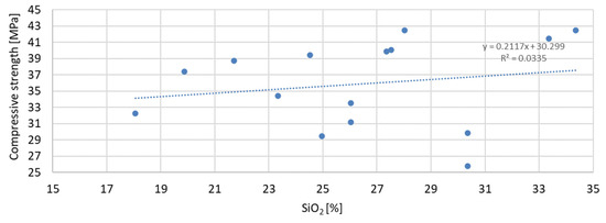 The greatest convergence of results is characteristic of samples after seven days of conditioning, for which the R-squared index of dependence on the specific surface area is 0.4059. Samples after 28 and 56 days of curing are characterized by the same dependence of results on the specific surface area. The R-squared index for them is 0.2654 and 0.2653, respectively. Therefore, in the case of the specific surface area, it should also be stated that compressive strength is not directly dependent on it. The lowest correlation of results was obtained for the dependence of compressive strength on the SiO2 content in the mortar mixture. The results of the obtained dependencies are presented in Figure 20, Figure 21 and Figure 22.