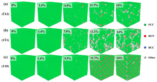 Figure 3 shows the crystal structure evolution of Al–4%Cu alloy single crystals under tension loading in different directions. Under tension along the <> direction, if the strain reaches 5.9%, that is, when the yield strain is reached, the stress drops sharply, and HCP atoms as well as other atoms emerge in the crystal. Other atoms are defects generated under tension, mainly concentrated at the heads of HCP atoms. As the strain increases, HCP atoms increase continuously. Due to the formation of defects and HCP atoms, the stress drops sharply after reaching the yield strain under the tension along the <> and <> directions. However, it shall be pointed out that the yield strain under tension in the <> direction is 7.9%, which is much larger than the yield strain under tension in the other two directions. Compared with the other two directions, more other atoms emerge under tension along the <> direction. This is because the <111> plane is a close-packed plane of atoms, which calls for greater strain to generate defects. Once defects are generated, the atomic arrangement around the defects will be disrupted, resulting in more other atoms. Figure 3c shows the evolution of crystal structure under tension along the <> direction, and it is found that periodic arrangement of HCP atomic planes occurs in the process of tension, resulting in fewer other atoms and fewer defects. Therefore, under tension along the <> direction, although the stress decreases in the plastic deformation stage, there is no surging decrease in stress like in the other two directions. That is because defects would not be generated easily under tension along the <> direction.