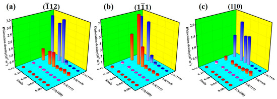 Figure 9 shows the variation of dislocation density under compression in different directions. In accordance with observations, regardless of the direction of compression, the dislocation density increases with strain. It is mainly dominated by Shockley partial dislocations, with a small amount of Stair-rod dislocations. That also serves as the reason for the generally consistent flow stress in the three compression directions in the later stage of plastic deformation.