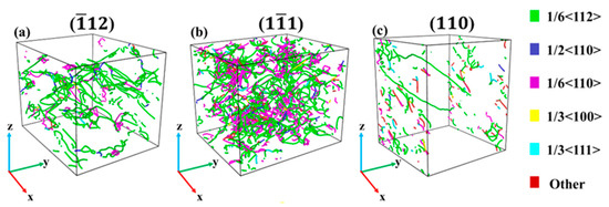 Figure 5 shows the dislocation structure diagram (with a strain of 14%) of Al–4%Cu alloy single crystals under tension along different directions. As shown by the analysis on dislocations, defects generated over the tension loading process of the crystal in Figure 3 are dislocations, and the HCP atoms are stacking faults. The crystal features a relatively high dislocation density under tension along atomic binding forces, mainly consisting of Shockley partial dislocations and Stair-rod dislocations. The motion of Shockley partial dislocations leads to the HCP atomic stacking faults [26], while the Stair-rod dislocation is prone to form Lomer–Cottrell dislocation locks [27,28,29]. The formation process is shown in Figure 6, and the formation of this dislocation lock could strengthen the material. Therefore, it can be observed that in Figure 2a, the flow stress in the later stage of plastic deformation under tension along the <> direction is higher than that in the other two directions. Under tension along the <> direction and <> direction, it is dominated by Shockley partial dislocations, so the flow stress is not high in the later stage of plastic deformation. It shall be pointed out that the dislocation density is lower under tension along the <> direction, and it is dominated by the HCP atomic stacking faults caused by Shockley partial dislocations. These stacking faults are intrinsic stacking faults. Due to the loose atomic arrangement of the <110> plane itself, it does not call for a large number of dislocation movements for atomic dislocation when subjected to tensile stress, so stress release is carried out in the form of stacking faults. The periodic arrangement of stacking faults shown in Figure 3c could strengthen the material [30], which is also the main reason for the stress increase in the later stage of plastic deformation under tension along the <> direction as shown in Figure 2a.