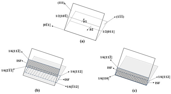 Formation process of Lomer–Cottrell dislocation lock. ((a) two dislocations in different directions; (b) two dislocations generate two stacking faults; (c) two stacking faults intersect to form Lomer-Cottrell dislocation lock).