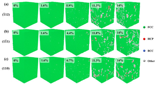 Figure 8 shows the evolution of crystal structure during compression in three different directions. In the elastic deformation stage, the crystal maintains a single FCC structure. As the strain increases, the crystal enters the plastic deformation stage, where the main plastic deformation mechanisms are dislocations and stacking faults. When compressed in the <> direction, if the strain reaches 5.9% of the yield strain, the increase in strain leads to lattice failure, resulting in defects. The formation and movement of defects cause a decrease in stress in the plastic deformation stage while generating HCP atoms, which is consistent with the crystal structure change under tension in that direction. The structural change of the crystal during compression along the <> direction is similar to the structural change process under tension. As the strain increases, defects and HCP atoms are formed. In comparison with tension conditions, crystal structure during compression along the <> direction does not show periodic HCP atomic planes alike but is still dominated by defects and HCP atoms as the strain increases.