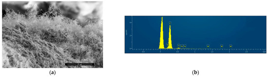 As shown in Figure 4a, the helical carbon fiber, for which the growth current of the sample is 2.9 A, was covered by tiny carbon fiber wraps. Area scanning was performed to obtain the Energy Dispersive Spectrum of the sample, the selected area was the entirety of Figure 4a. The presence of C and O peaks was observed in Figure 4b, while Fe and W peaks were absent, indicating the absence of both Fe and W in the sample. This suggests that there was no diffusion of iron wire substrate into the carbon fiber sample, and the tungsten needle electrode was not sprayed onto the sample.