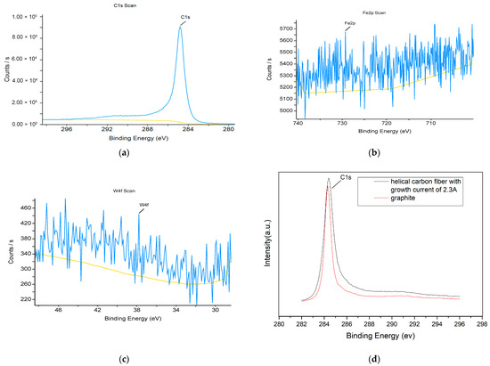 The surface chemical composition and valence state of helical carbon fiber with growth current of 2.3 A were determined by XPS measurement. Compounds were identified by corresponding binding energy peaks. XPS analysis was performed using Avantage software (v5). The XPS spectrum is shown in Figure 5a–c, and the measured spectra were C1s, Fe2p and W4f. The fitting atom percentages of carbon, iron and tungsten at the surface of the helical carbon fiber were 99.56%, 0.39% and 0.05%. The data show that the helical carbon fiber obviously did not contain iron and tungsten. As shown in Figure 5d, the XPS pattern of the sample was compared with that of graphite, and it was found that the C1s peak of graphite was 284.3 ev with a half-peak width of 0.6 ev, while the C1s peak of helical carbon fiber was 284.4 ev with a half-peak width of 0.9 ev. This shows that the binding energy peak of the sample broadened towards high energy. The fitting results of the XPS C1s peak in the diamond-like carbon film showed a peak at 284.3 ev for C sp2 and a higher peak at 295.3 ev for C sp3, indicating that the binding energy of C sp3 was greater than that of C sp2 [11]. We believe that the peak shift of the sample was due to the incorporation of C sp3 into the graphite layer as an impurity.