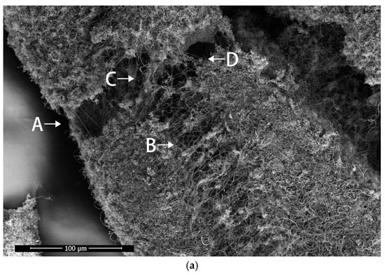 Figure 12a is a tear diagram of the helical carbon fiber skeleton; the growth current condition of the sample is 2.7 A. It can be observed that there are carbon fiber links in the form of nearly straight lines at both ends of the fracture, and the carbon fibers are stretched at A, B, C and D in the figure.