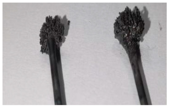 Conversely, setting the growth current at around 3.0 A led to lower discharge power that allowed for appropriate head growth on tungsten needle electrodes while also causing them to become larger over time, as shown by Figure 13. Unfortunately, this eventually resulted in the termination of experiments due to discharges occurring with graphite cavity side walls. Therefore, in order for the instrument to perform sample growth efficiently and continuously, the current size should be controlled between 2.3 A and 2.9 A.