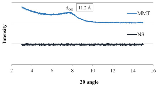 The recorded diffractograms of MMT–NS conjugates and reference samples are summarized in charts for individual conditions of the intercalation and hydration processes and are presented in Figure 2.