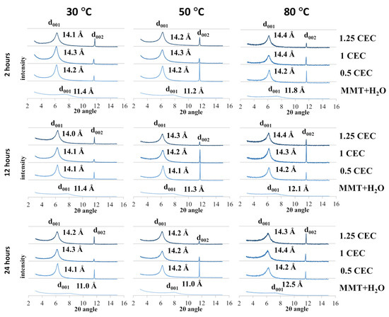 Preparation of montmorillonite–drug conjugates in an aqueous suspension involved the incorporation of drug molecules between MMT packages, most often accompanied by water molecules. Therefore, the examination of reference samples obtained by mixing montmorillonite with water in conditions analogous to the intercalation process was aimed at checking what effect, especially at elevated temperature, the water present in suspension has on the hydration of montmorillonite and how the accumulation of water in the interlayer spaces associated with hydration increases interlayer distance.