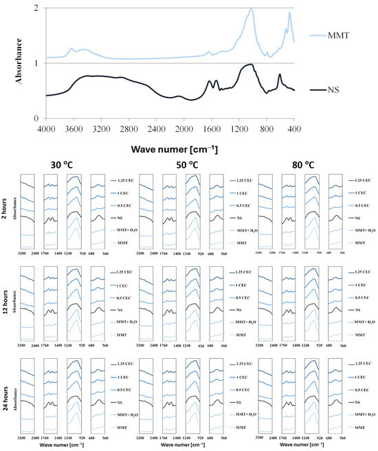 In the hydrated reference samples (MMT + H2O), no major changes were noted compared to the initial (dry) montmorillonite and slight differences in the intensity of the bands related to the presence of water were noticed only for samples subjected to the hydration process at elevated temperatures (50 and 80 °C).