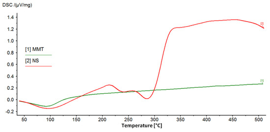 Figure 4 shows the DSC curves recorded for the starting materials used to prepare the conjugates, which clearly show the peaks characterizing the behavior of MMT and NS with increasing temperature. The broad endothermic peak at around 100 °C in the MMT curve corresponds to the loss of water adsorbed on the montmorillonite surface. However, in the measured temperature range, dehydroxylation of the mineral is not visible and the loss of structural water in the form of OH groups is associated with drastic changes in the structure of the mineral and is usually observed at temperatures of 600–750 °C [12,55].