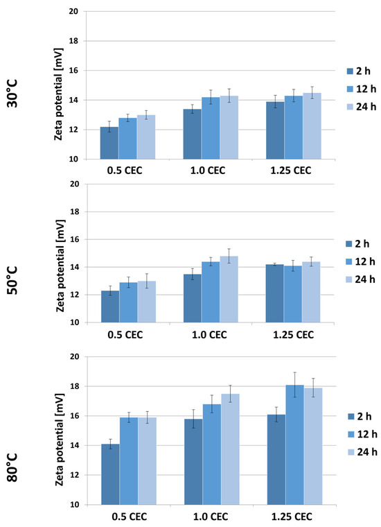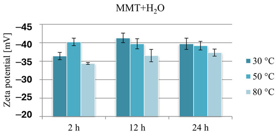 Figure 6 compares the Zeta potential values of montmorillonite subjected to hydration under various conditions and clearly shows that because of the hydration process, the negative potential of montmorillonite increases by approximately 10 mV. The lowest potential in absolute value, ranging from −34.4 to −37.3 mV, was recorded in the case of reference samples obtained at 80 °C. The Zeta potential of montmorillonite hydrated at 30 or 50 °C, except for the sample hydrated for 2 h at 30 °C, was in a narrow range from −39.2 to −41.3 mV.