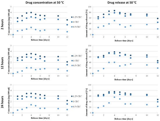 In the case of 0.5 CEC conjugates, the plotted relationship between the amount of drug released and the release time is less stable but it is visible that during the first day, 26%, 10%, and 19% of neomycin was released from the carriers obtained for 2, 12, and 24 h, respectively. Unfortunately, in the further release phase, the amount of released drug reaches a maximum of 56%, which is a much worse result than that obtained in the case of the 1.0 CEC and 1.25 CEC conjugates. Additionally, significant fluctuations in drug concentration were noted (in the range from 0.3 to 1.5 mg/100 mL), especially in the case of conjugates obtained at 50 °C for 24 h. A clear maximum was recorded on the fourth day after the start of the experiment, and until the 10th day, the amount of drug released remained at approximately 30%. Therefore, much more favorable profiles from the point of view of sustained antibiotic release were recorded for the 1.0 CEC and 1.25 CEC conjugates.