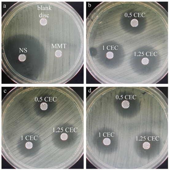 Zones of inhibition of the growth of E. coli bacteria for (a) montmorillonite (MMT), neomycin sulfate (NS), and a disc containing no antibiotic (blank disc) and (b) a series of MMT–NS conjugates obtained at a temperature of 50 °C for 2 h (b), 12 h (c), and 24 h (d).