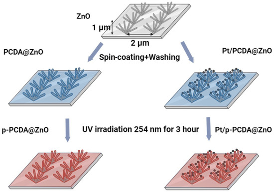 The schematic explanation of fabricating p-PCDA@ZnO and Pt/p-PCDA@ZnO hybrid photoanodes is shown in Figure 1. 10,12-pentacosadiynoic acid (p-PCDA, ≥97.0%, Sigma Aldrich) was dissolved in acetone (99.5%) with a concentration of 1 mg/mL to prepare the p-PCDA@ZnO photoanode. This solution was filtered with 0.45 μm of a PTFE-D syringe filter (Hyundai micro, Seoul, Republic of Korea) and then spread onto the ZnO nanoflowers via spin-coating at 1000 rpm for 30 s followed by washing with ethyl alcohol (95%). The spin-coating method was used for an even distribution of PCDA. There was no other treatment needed since PCDA has carboxylic groups that have an affinity with ZnO. This affinity originates from the O-Zn mono, bi-dentate, or bridging interaction mechanism [21]. Afterwards, washing with ethanol was necessary to prevent the deposition of a thick layer of PCDA and to ensure the formation of a monolayer. This process was repeated four times. After monolayer deposition, photopolymerization of PCDA was conducted with a UV lamp (ENF- 240C/FE, Spectro-UV, Farmingdale, NY, USA) for 180 min. at 254 nm [22]. The UV light irradiation forces pairs of triple bonds to break and interact with neighboring molecules to form conjugated polymers [23]. According to Kantha et al., macrocyclic diacetylene photopolymerization was completed in 3 h at 254 nm UV irradiation [24]. Therefore, photopolymerization of the PCDA monolayer was conducted under the same conditions.