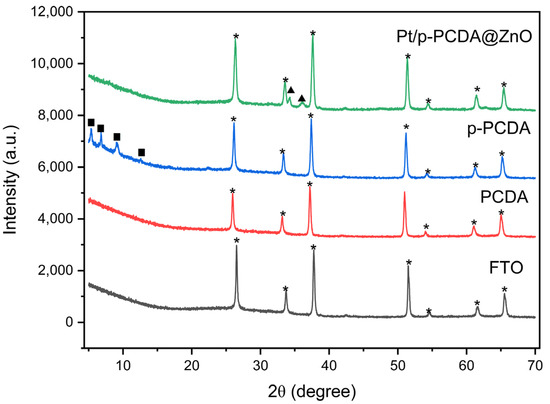 The XRD data of FTO, PCDA, p-PCDA, and Pt/p-PCDA@ZnO. The peaks marked by stars, solid squares and solid triangles originate from FTO glass, p-PCDA polymer film and ZnO nanoflowers.